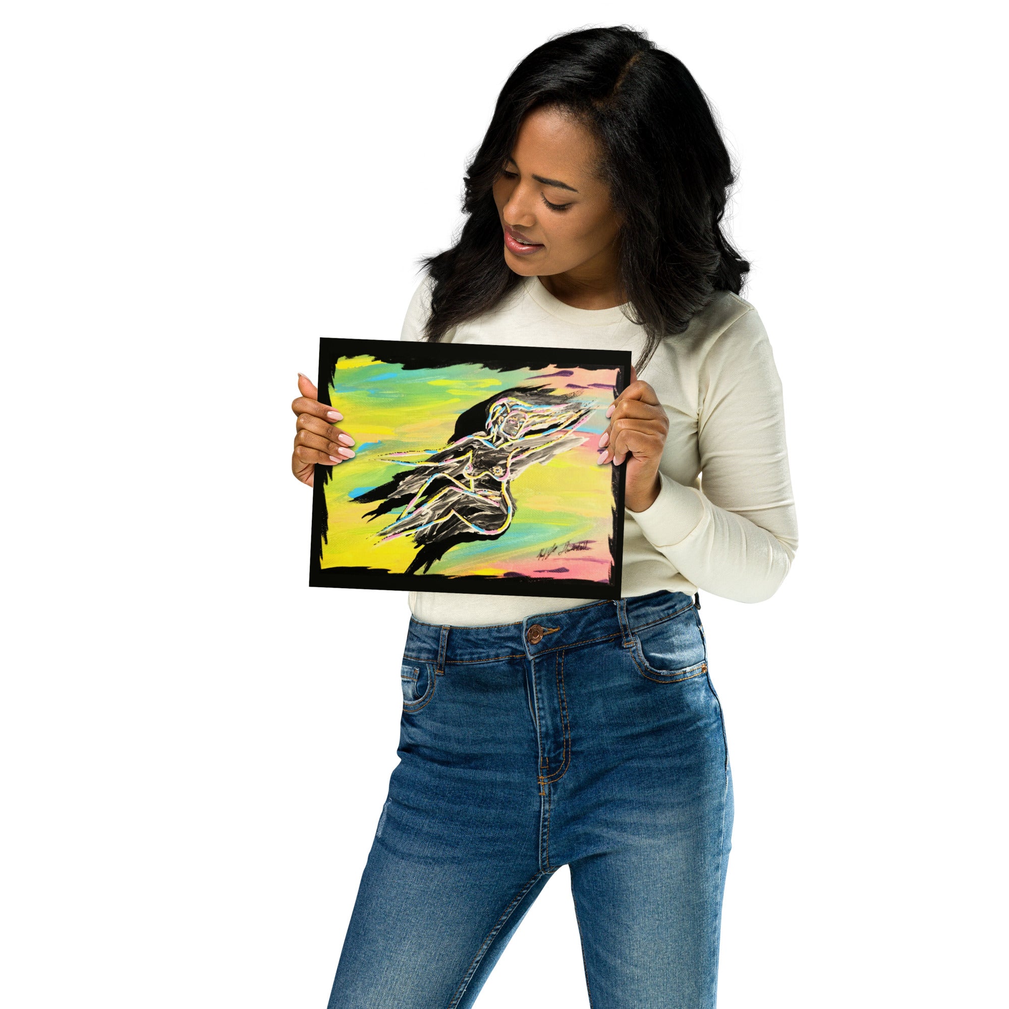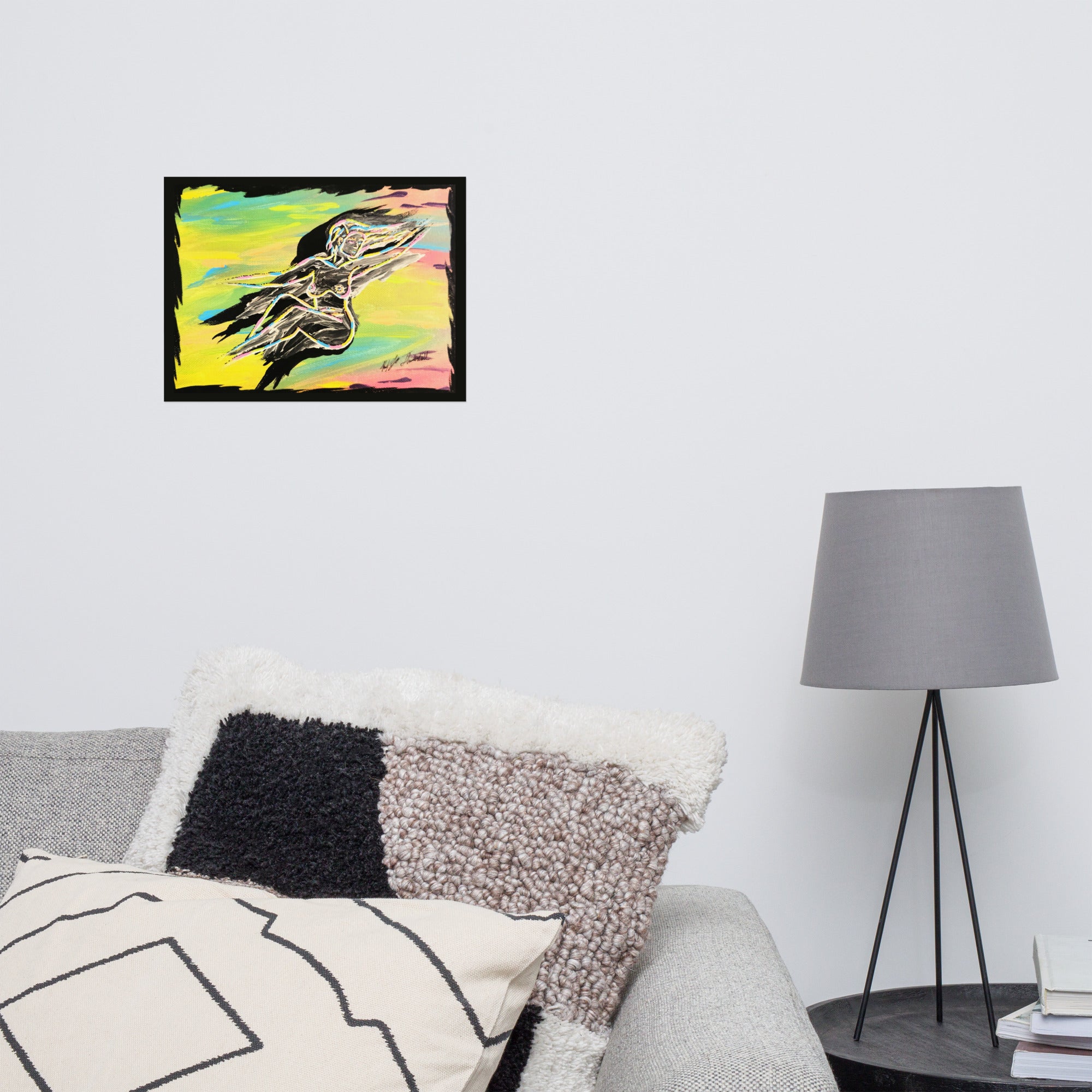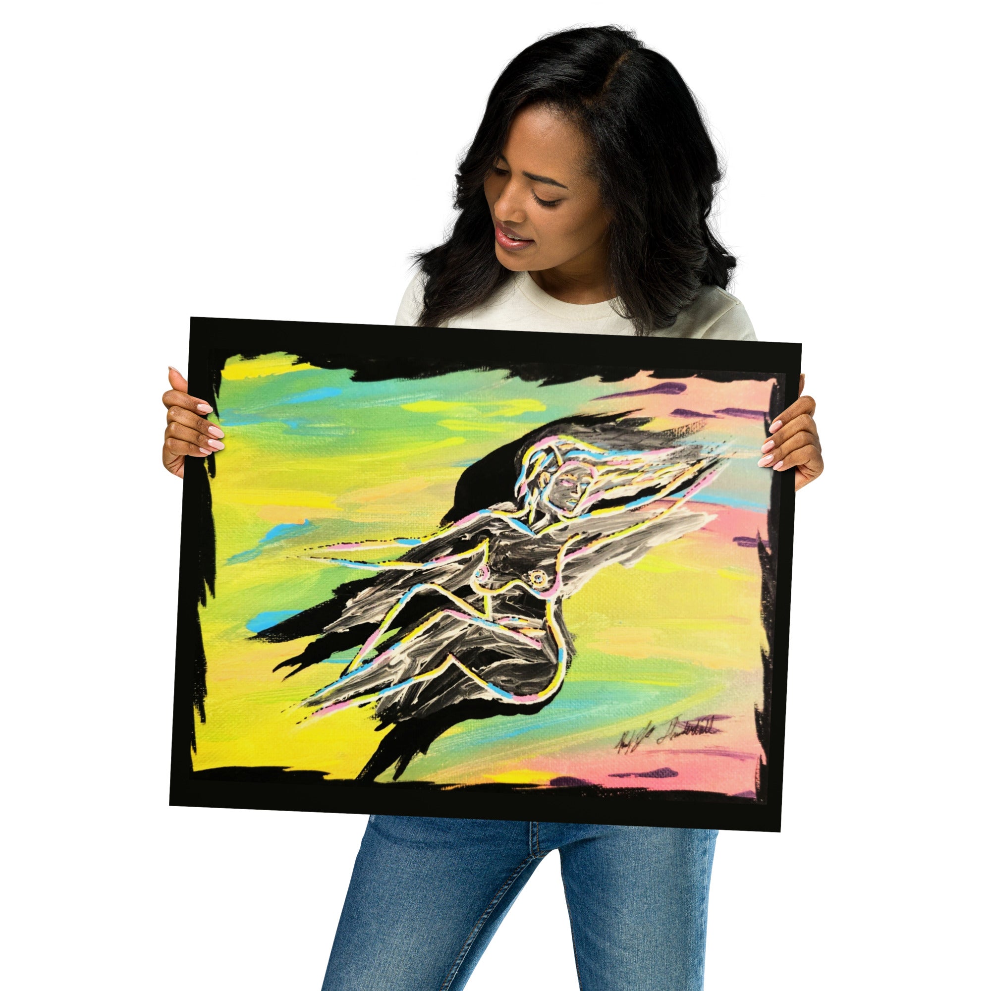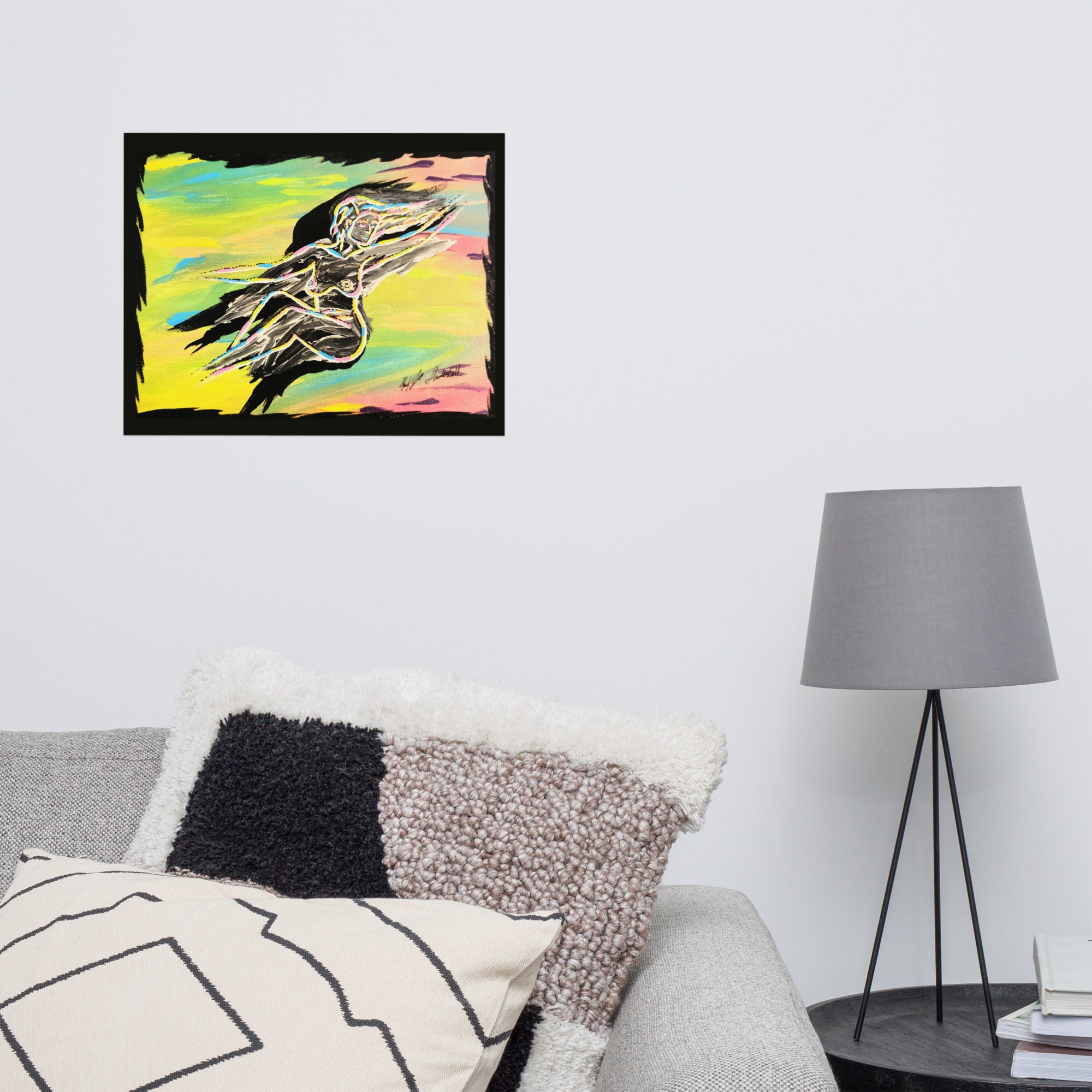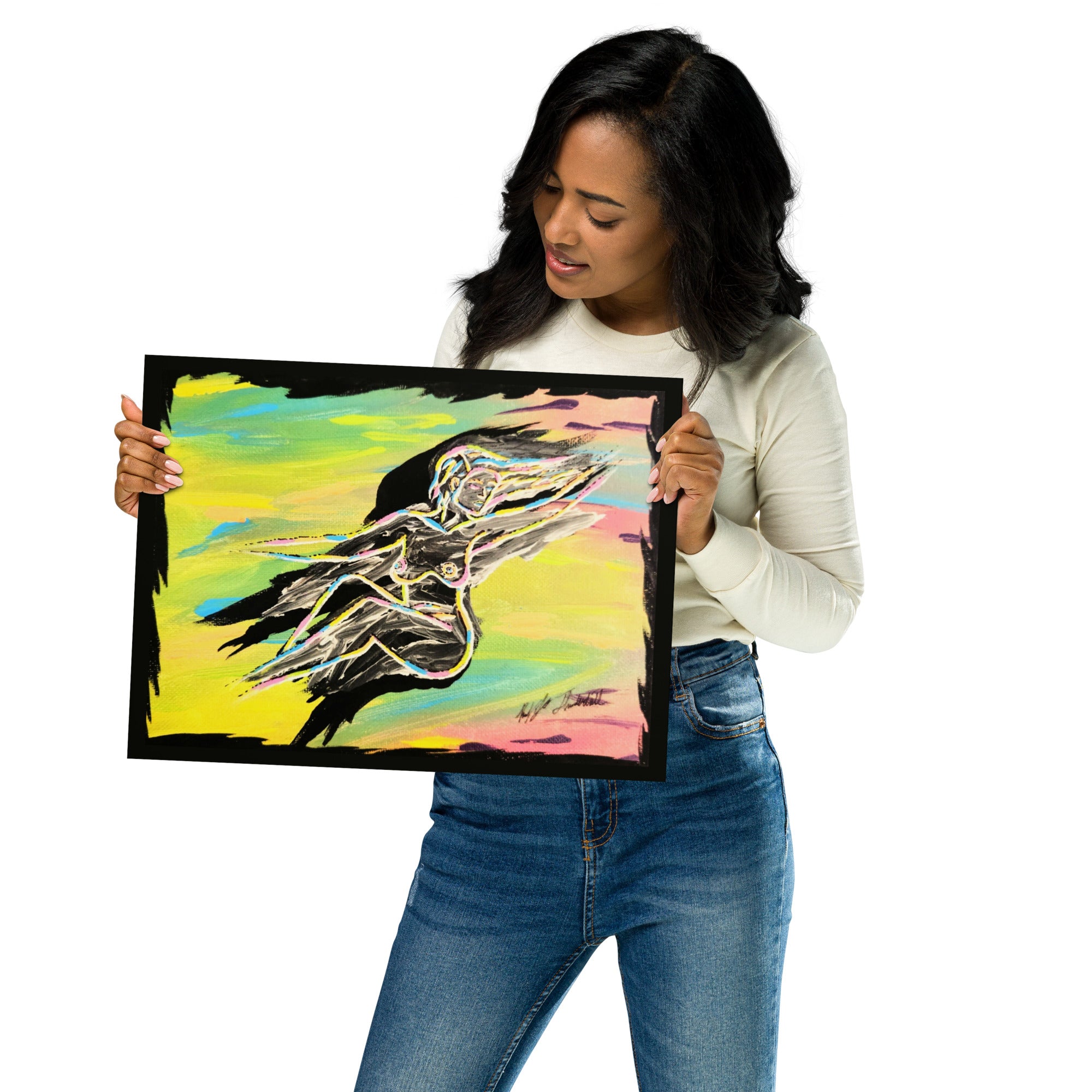 This piece titled “Finding My True Colors” depicts a woman being formed from a sea of vibrancy. As her form begins to take shape, and her shadow casts a black void into the sea, she is engulfed in color for the first time. This colorful piece is a joy to have in any space, and the energy of this artwork is sure to add a little flair to anyone’s life.