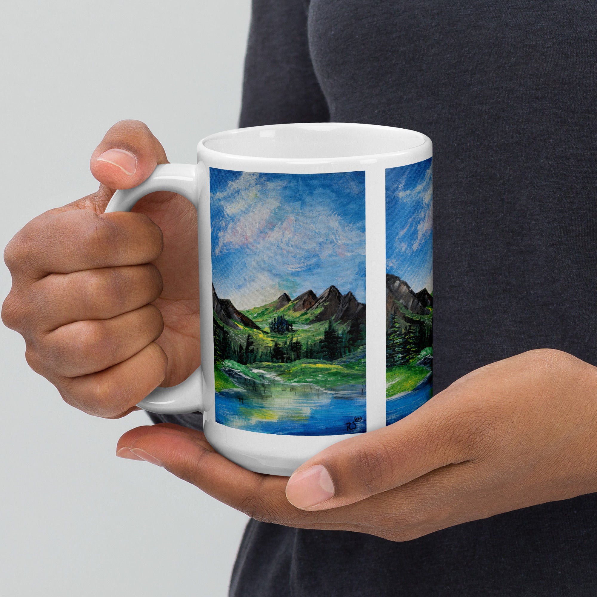 This scenic landscape titled “The View I Wish was Outside my Window” is of a peaceful mountain meadow. The vibrant colors of the water and plant life captured in this piece provide the perfect compliment to the beautiful sky above the mountains. This artwork evokes the feelings of a Summer day spent outdoors, and is a great way to bring a beautiful piece of nature into your life.