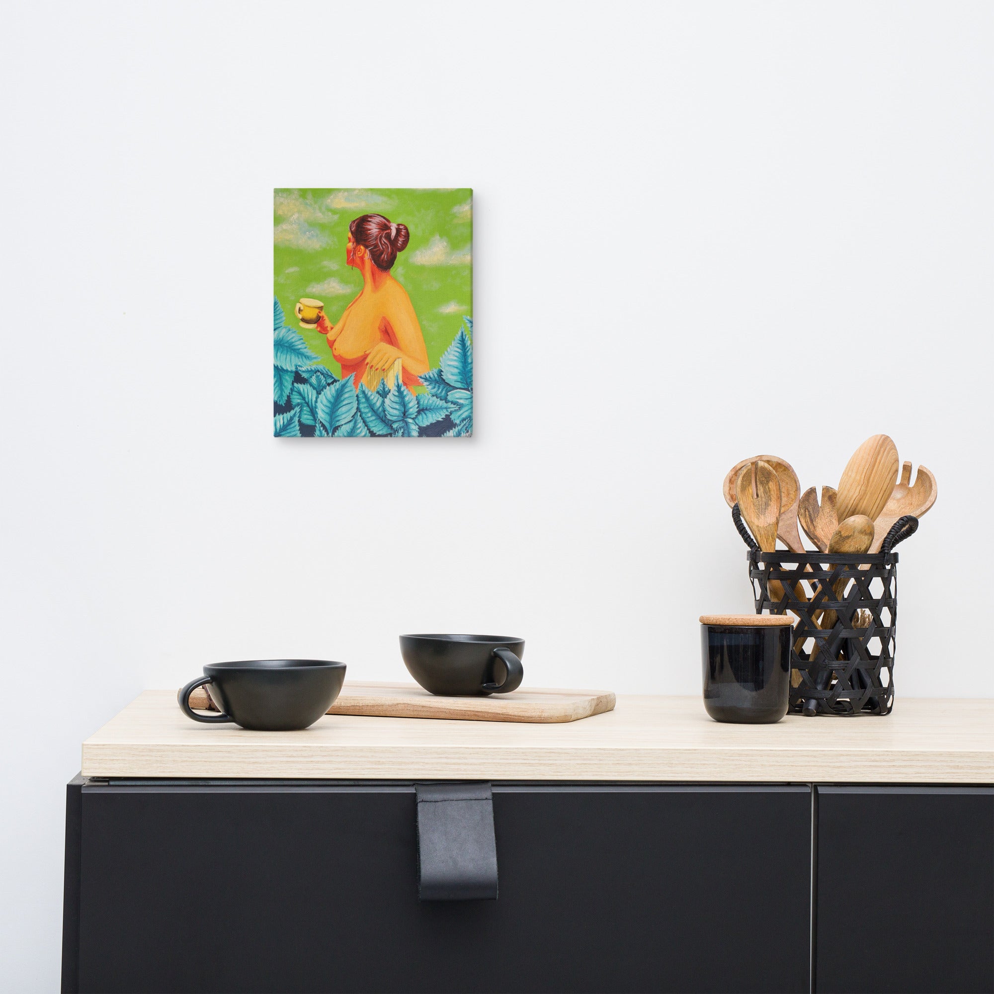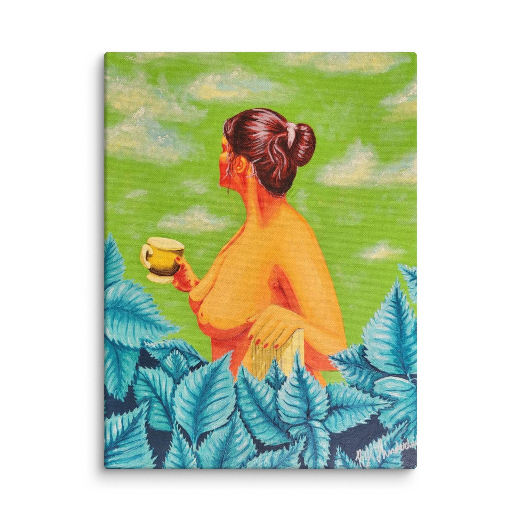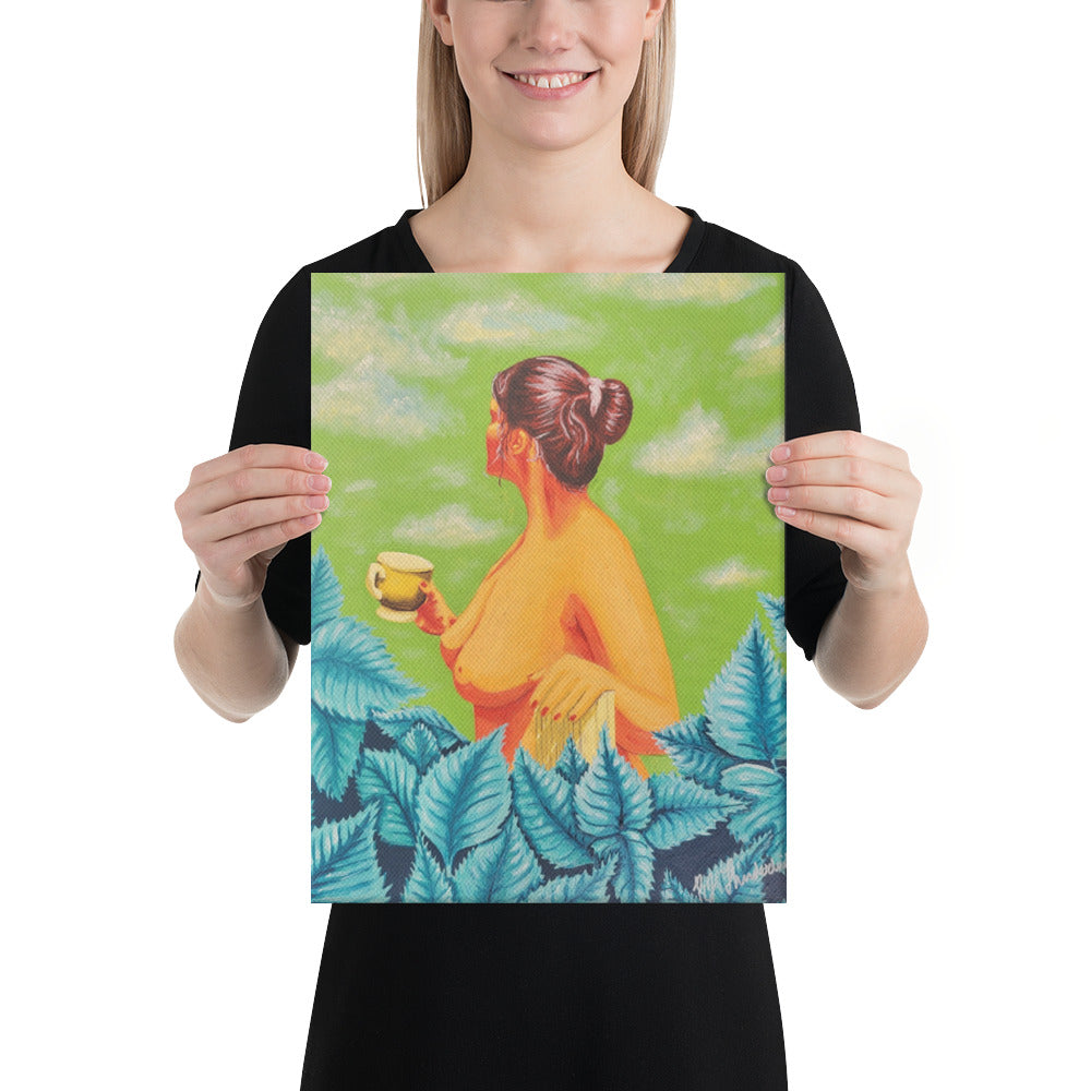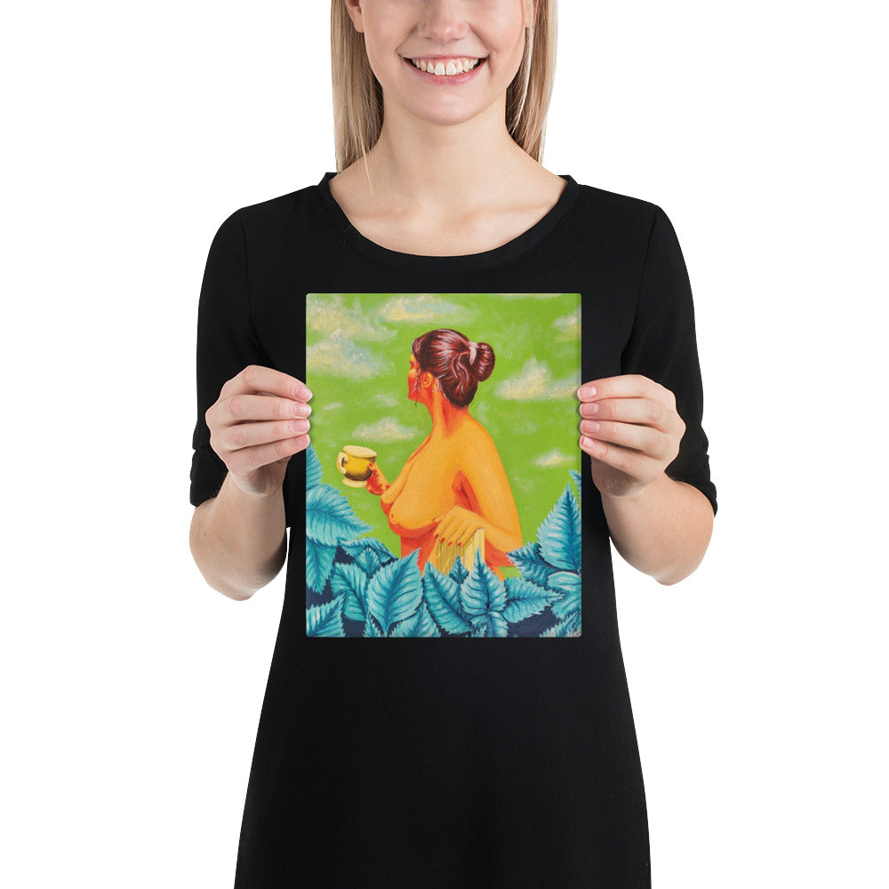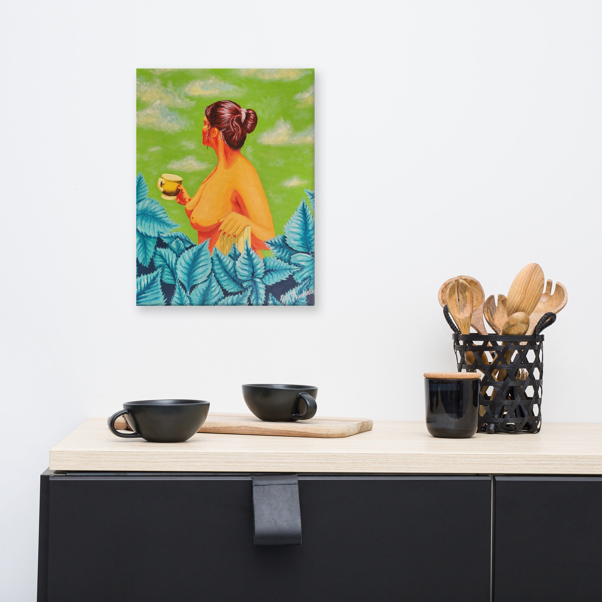 This incredible piece titled “Unbothered” is a powerful and bold artwork of a topless woman outside with her mug of tea. It is a true statement piece with its bright color palette and feminist subject matter. The emotions this art evokes leaves every ally who sees it feeling empowered and confident!