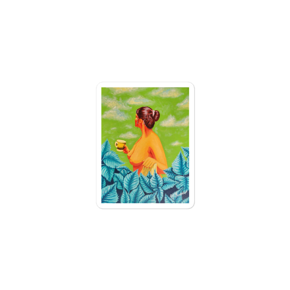 This incredible piece titled “Unbothered” is a powerful and bold artwork of a topless woman outside with her mug of tea. It is a true statement piece with its bright color palette and feminist subject matter. The emotions this art evokes leaves every ally who sees it feeling empowered and confident!